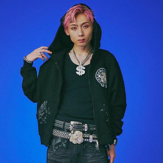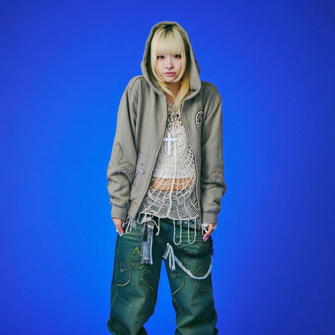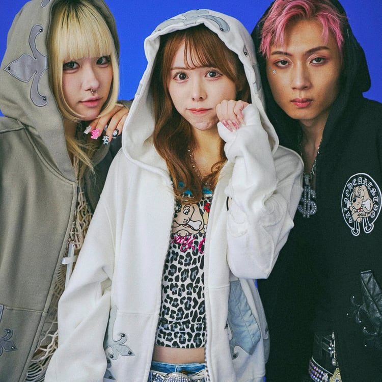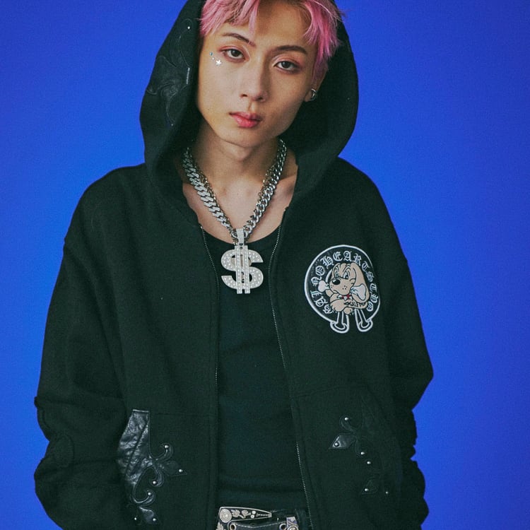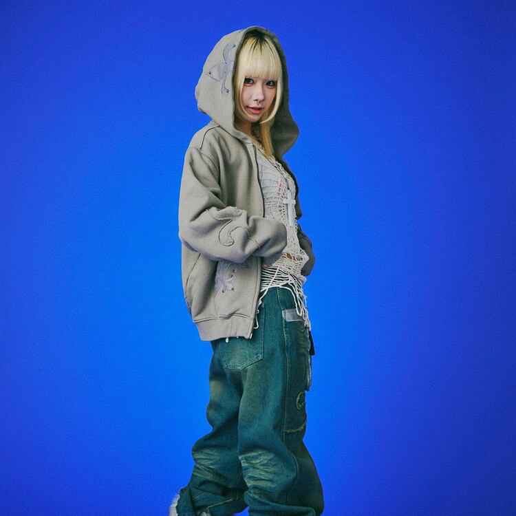フード・フロントポケット・左右の腰に百合モチーフのレザーパッチを配置し、さらにスタッズを打ち込んでギラつき倍増。視線を奪うインパクトと、GALFYらしい不良感をしっかりと落とし込んだデザインだ。